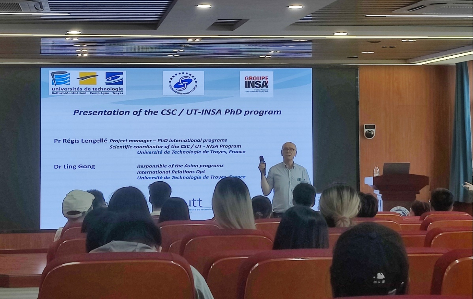 法国UTT大学教授,UT-INSA/CSC项目评审委员会主席Régis LENGELLE先生首先概述了此次宣讲会的主要内容,并生动形象地介绍了法国的高等教育系统的历史以及UT-INSA应用科学院集团。