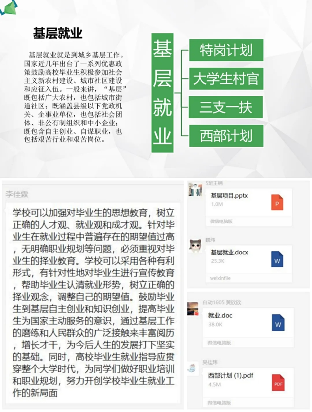 针对基层就业问题,自动化党小组代表元志伟同志分别介绍了“特岗计划”、“大学生村官”、“三支一扶”计划、“西部计划”等基层就业项目,同时介绍了参与中央部门组织实施的基层就业项目服务期满后享受的优惠政策。元志伟同志呼吁大家积极参与到基层项目中,今年高校毕业生就业渠道拓宽,基层项目规模扩大,参与到基层服务项目中无论对个人还是对国家都是有百利而无一害的。