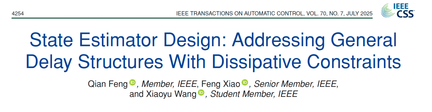 近日,澳门网投官方网站澳门网投官方网站肖峰教授团队在国际控制领域顶级期刊 IEEE Transactions on Automatic Control 发表了题为“State Estimator Design: Addressing General Delay Structures With Dissipative Constraints”的长文(Full Paper)研究论文。论文刊登于2025年第70卷第7期(4254–4269),DOI:10.1109/TAC.2024.3520835。澳门网投官方网站为论文第一完成单位,澳门网投官方网站青年教师冯谦为论文第一作者,肖峰教授为通讯作者,博士生王晓宇参与完成了相关研究工作。