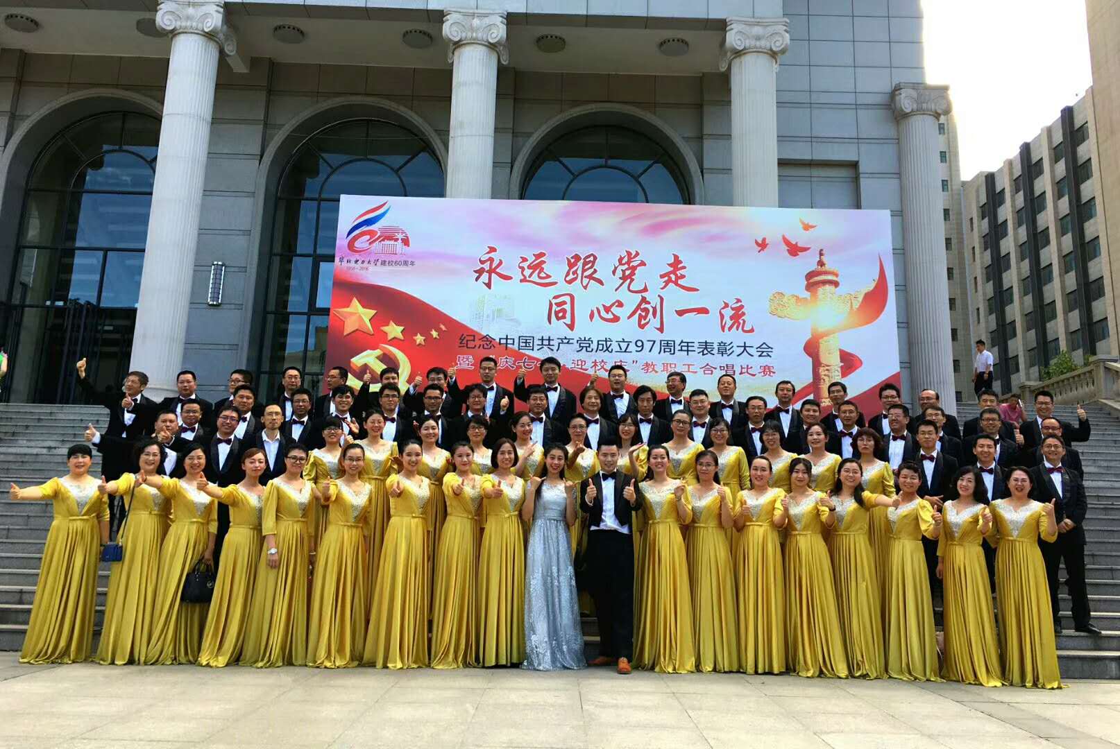 在中国共产党成立97周年之际,为充分展示我校基层党组织、共产党员和党务工作者的良好形象,同时为迎接建校60周年营造良好氛围,学校于6月27日下午在主楼礼堂举办纪念中国共产党成立97周年表彰大会暨“庆七一?迎校庆”教职工合唱比赛。