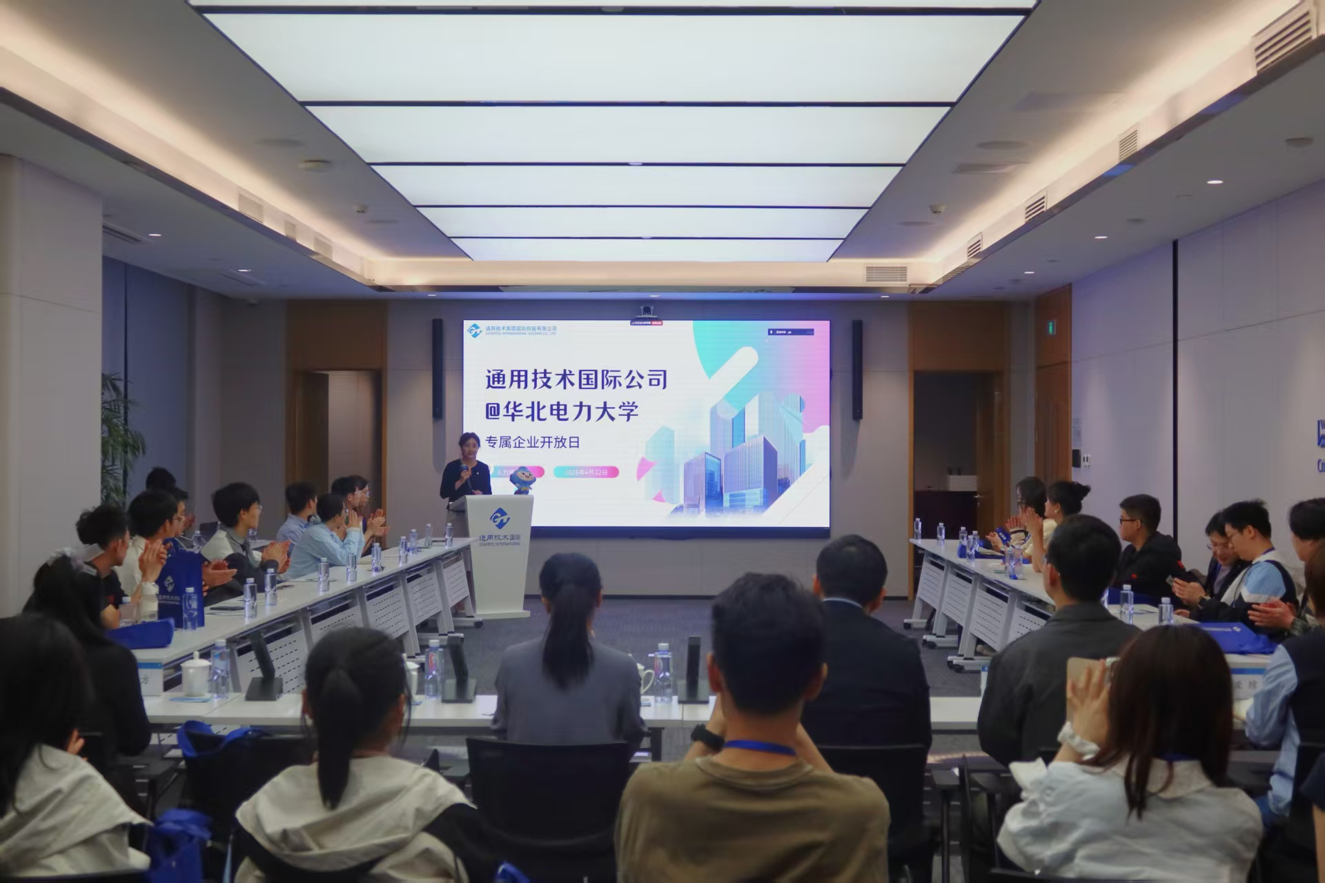 随后,双方开展交流座谈,华电01级校友王鹏、16级校友陈天达分享职业成长故事。王鹏校友与大家详细介绍了通用技术公司的业务分布、发展方向等情况,并分享了其自身在通用技术公司的成长经历与心得,鼓励同学们开阔视野,敢于挑战。陈天达校友在线上也与同学们分享了自己在孟加拉的工作经历。最后,人资部门详细介绍了人才培养体系、人员选拔标准及通新粉暑期实习计划,并对同学们来通用技术国际公司实习、工作表示期待与欢迎。